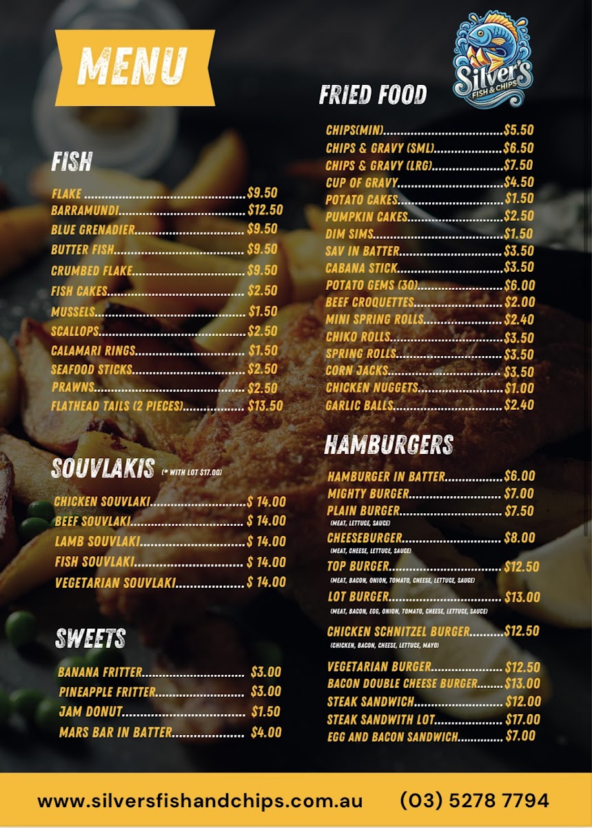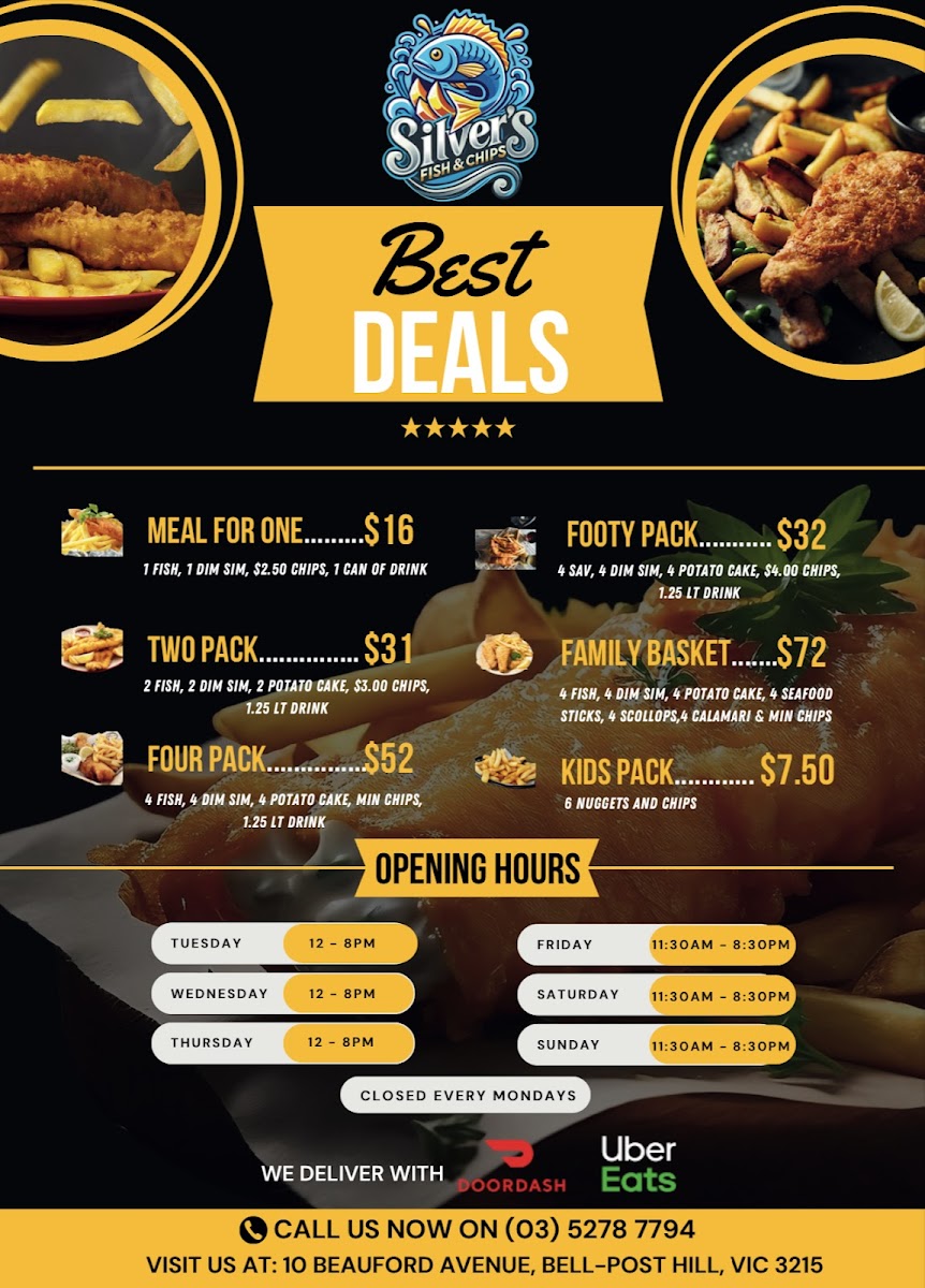 Welcome to SILVER’S FISH & CHIPS, a cherished seafood haven located at 10 Beauford Ave, Bell Post Hill, VIC. This delightful eatery specializes in delivering fresh, crispy fish and chips that delight the palate. Their standout offerings include succulent options like Flake, Barramundi, and Blue Grenadier, all prepared with a perfectly crispy batter. Customers rave about the quality, noting that each bite promises flaky, tender fish that's hard to resist.